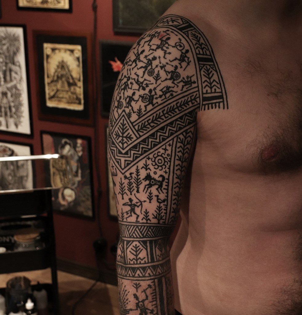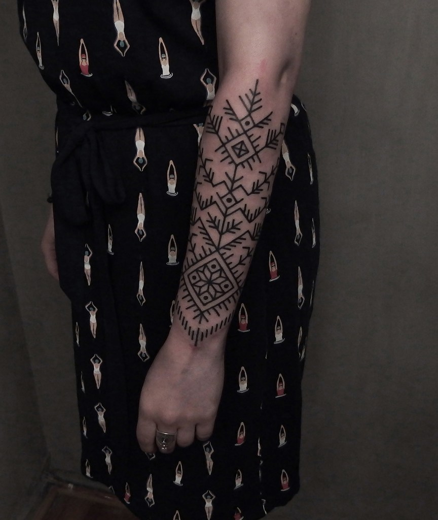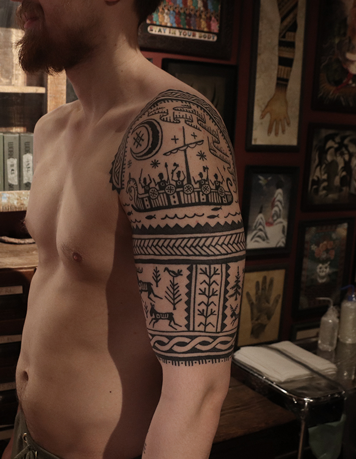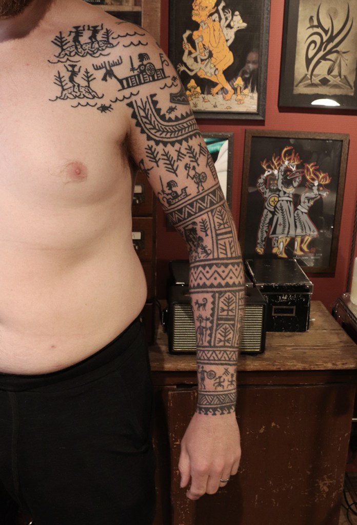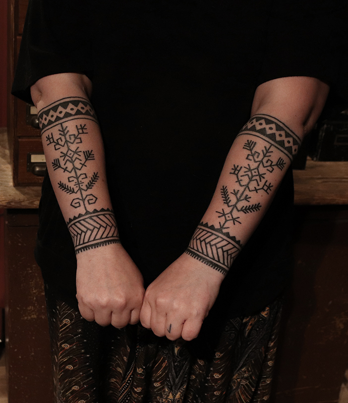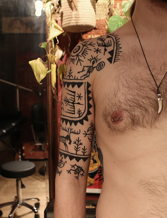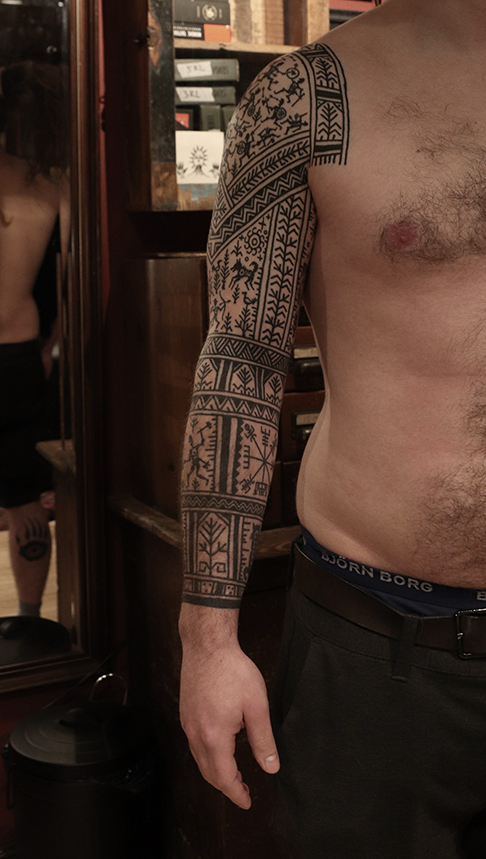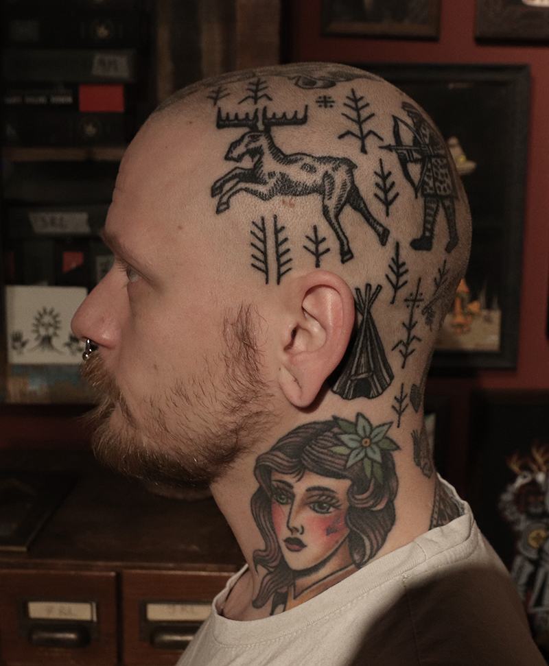 Tatuointiliikkeissä olen työskennellyt vuodesta 2012. Koen vanhat heimokulttuurit ja erilaiset kansanperinteet ja tarinat loputtomana inspiraation lähteenä. Karjalaiset ja muut kotimaiset perinnekuviot ja symbolit ovat olleet päämielenkiintoni viimeiset vuodet, samoin kalliopiirrokset. Toki teen mielelläni muunkin tyylisiä kuvia, eikä kuvan tarvitse aina olla jostakin tietystä kulttuurista tai perinteestä.