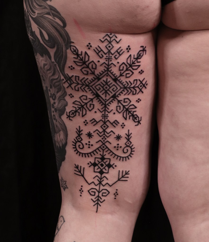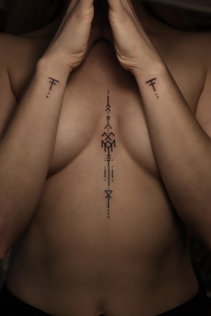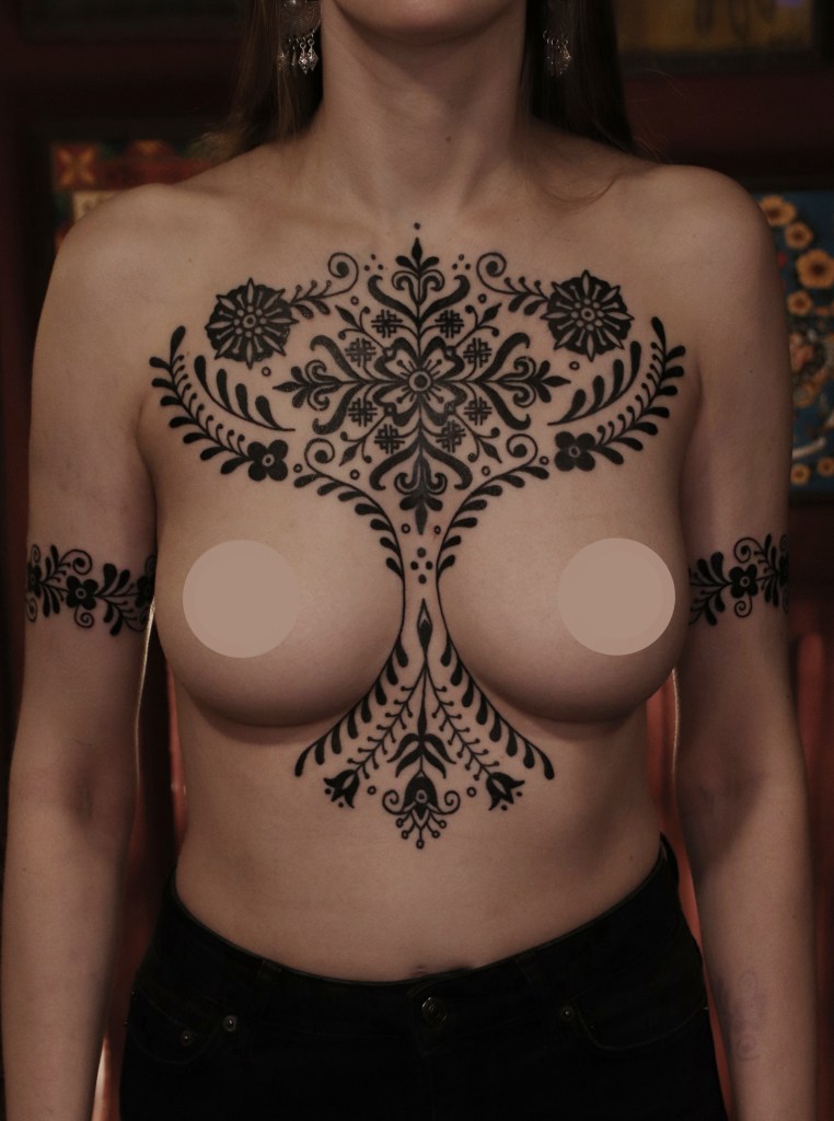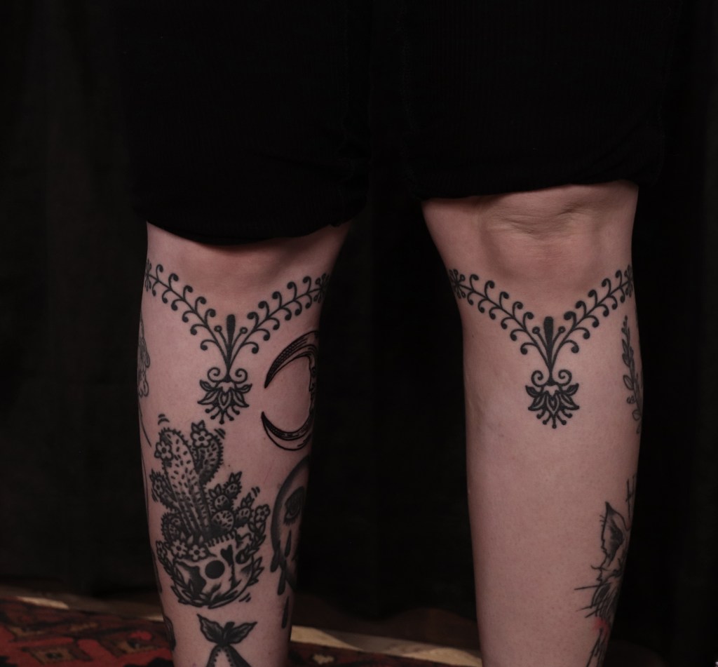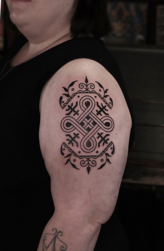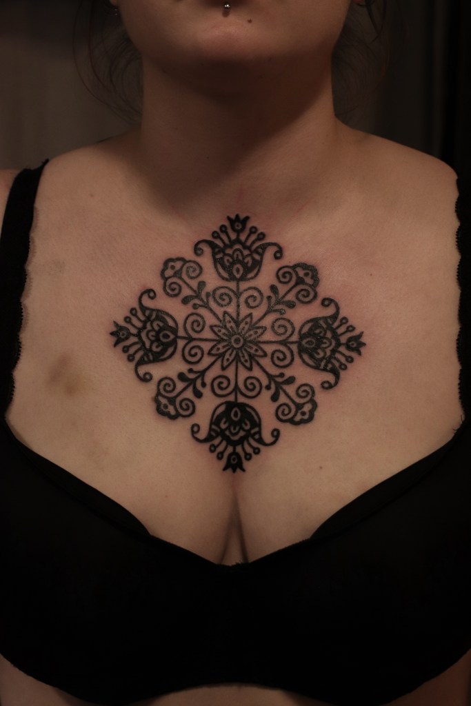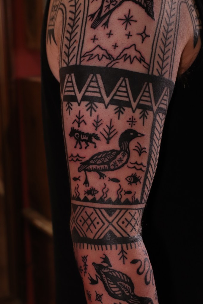 Tatuoinneissa lähellä sydäntäni ovat voimakkaat linjat, vahvat kontrastit ja ajaton tunnelma. Yliopistossa vietettyjen vuosien aikana kahlasin läpi uskontotieteen ja kulttuurien tutkimuksen kursseja, joista ammennan työskentelyssäni inspiroituen muun muassa kansanperinteistä, vanhoista tarinoista, mytologioista ja symboliikasta. Teen toki mielelläni myös muunlaisia tatuointeja, kysy rohkeasti!
